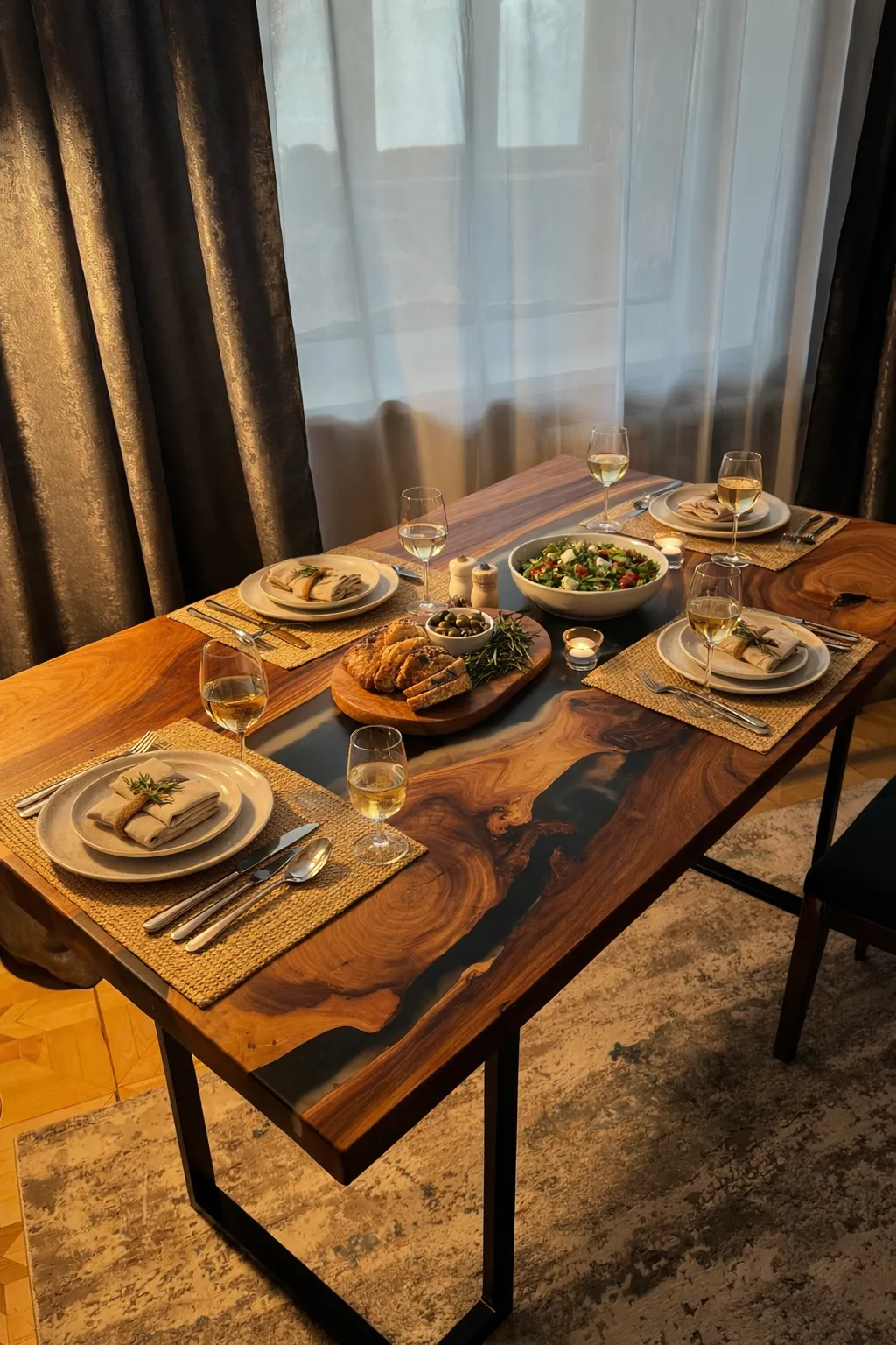 Дизайнерский обеденный стол из массива ореха с эпоксидной смолой «Мраморный орех» — это роскошное решение для тех, кто ценит уникальность и природную красоту. Столешница выполнена в технике «река» с использованием премиального массива ореха с глубокими шоколадно-коричневыми оттенками и прозрачной эпоксидной смолы черного цвета с мраморными белыми прожилками, создающими эффект натурального мрамора.