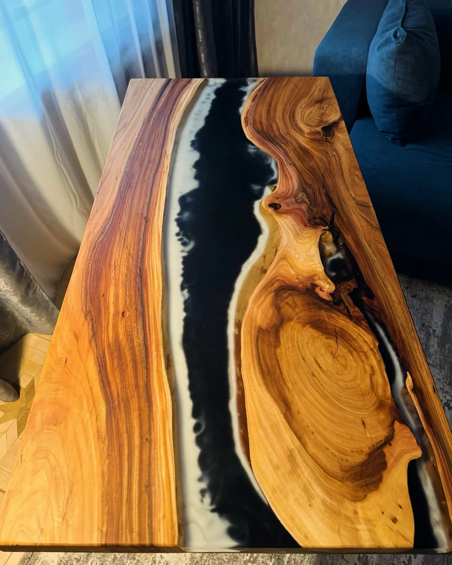 Эпоксидная смола черного цвета с белыми мраморными разводами проходит по центру столешницы, создавая эффектный контраст с теплыми оттенками ореха. Мраморные прожилки создают визуальную глубину и имитируют рисунок натурального камня. Прозрачность смолы позволяет видеть текстуру древесины в местах соединения, создавая многослойность.