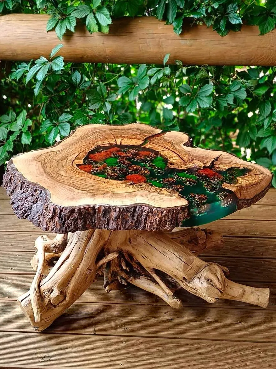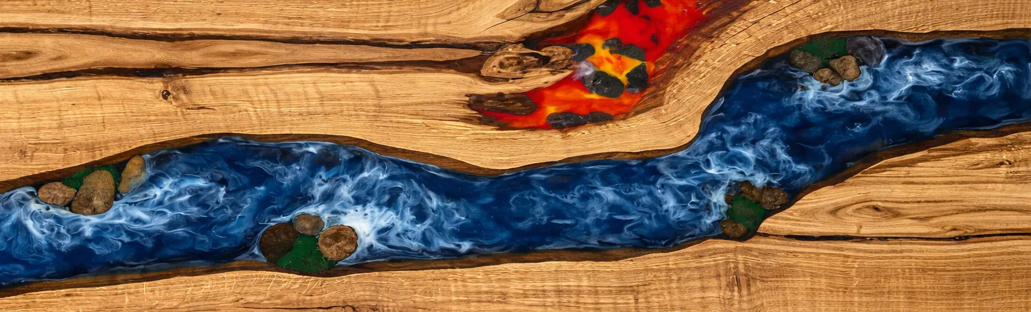 В работе используются проверенные породы древесины и профессиональная мебельная эпоксидная смола, устойчивая к влаге, ультрафиолету и механическим нагрузкам. Каждый этап производства контролируется вручную.